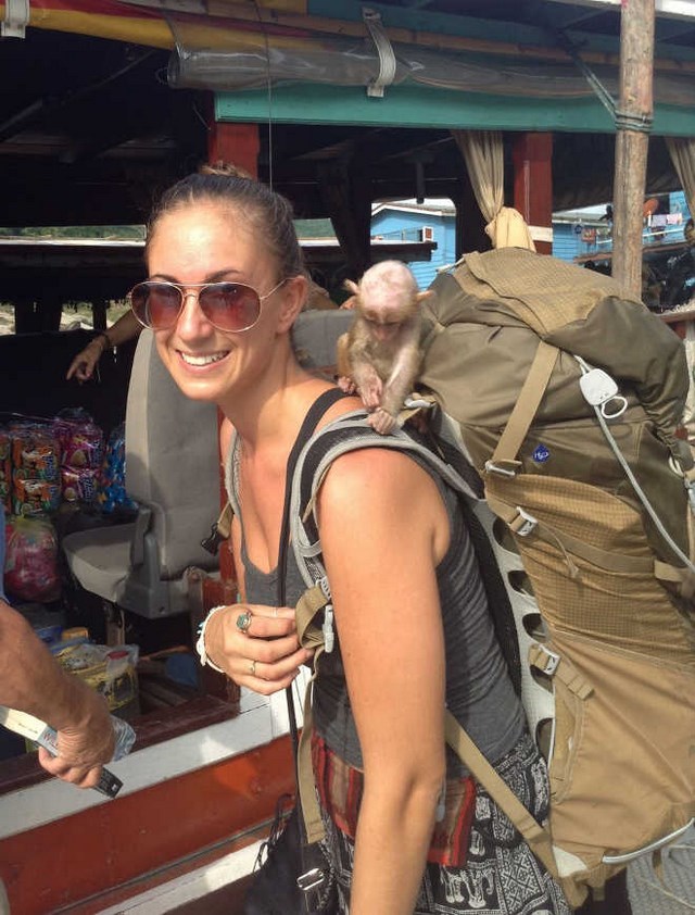 Luego de pasar la noche con el monito del lado de fuera del único albergue de la ciudad (que no permitió que ella entrase con el pequeño mono agarrado en su cuello), ella llamó a su madre que estaba en Estados Unidos y le pidió ayuda "Yo le dije que si nosotros no lográbamos encontrar un santuario para el, probablemente me tendría que quedar en Laos hasta que el decidiera dejar de existir de viejito"